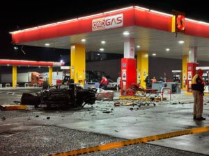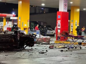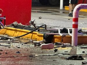 El fatal suceso se registró minutos antes de la 1:00 de la madrugada de este lunes cuando el vehículo, al parecer era conducido a alta velocidad y perdió el control, por lo que impactó directamente contra las bombas despachadoras de la estación de servicio.