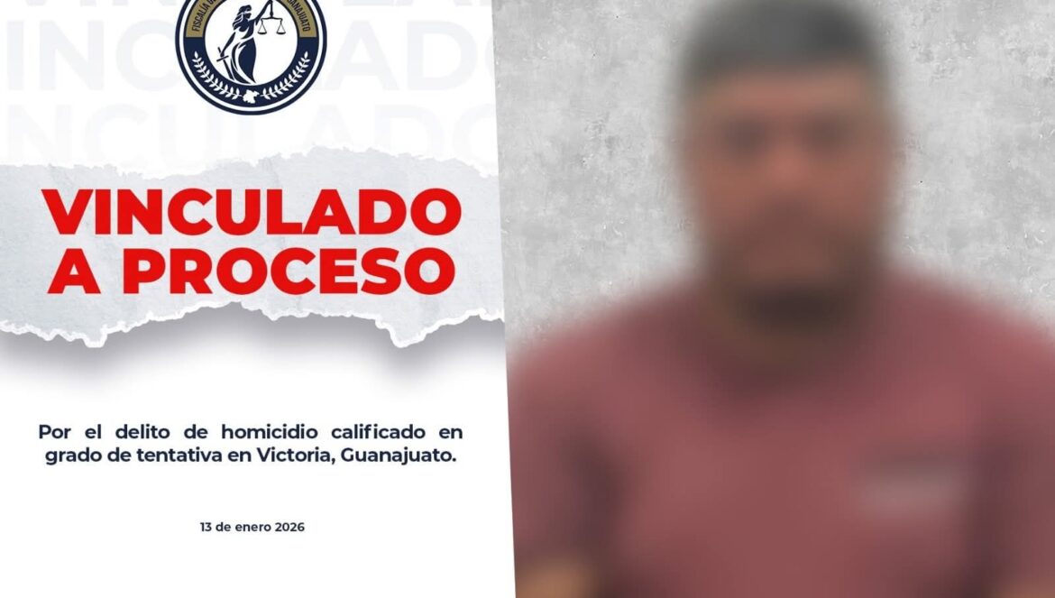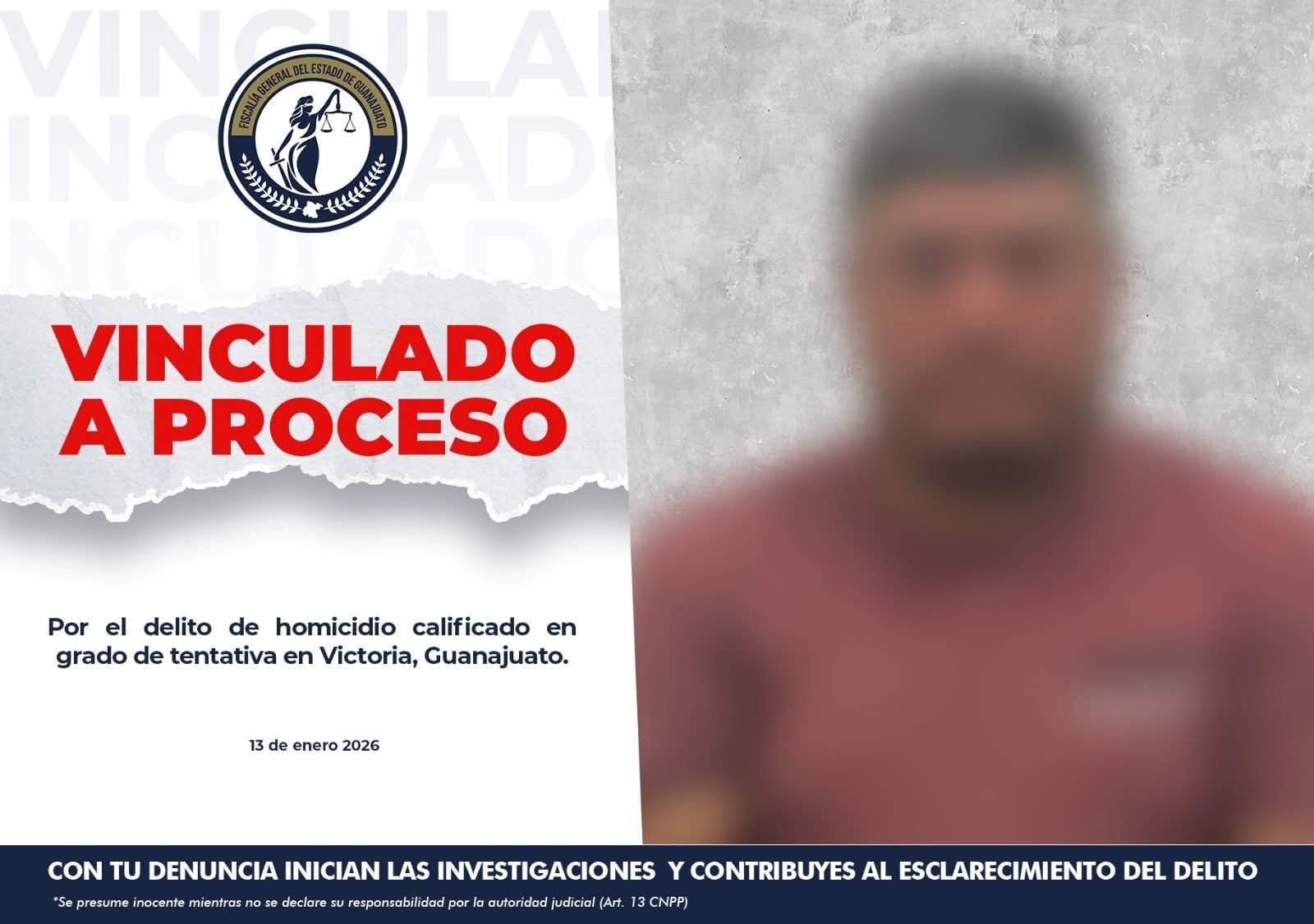 Victoria, Gto. (13/1/2026).- Tras cumplimentar una orden de aprehensión y ser presentadas pruebas contundentes, la Fiscalía General del Estado ha logrado que un Juez de Control dicte auto de vinculación a proceso penal en contra de Omar, como presunto responsable del delito de homicidio calificado en grado de tentativa en el municipio de Victoria.