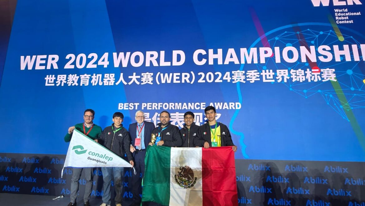 Silao, Gto. (17/12/2024).- El equipo ROBOCON del Plantel CONALEP Silao conquistó el escenario internacional al obtener el 1er. Lugar Mundial en el Torneo de Robótica WER 2024 WORLD CHAMPIONSHIP, celebrado el pasado 14 de diciembre en el Centro Nacional de Exposiciones de Shanghái, China.