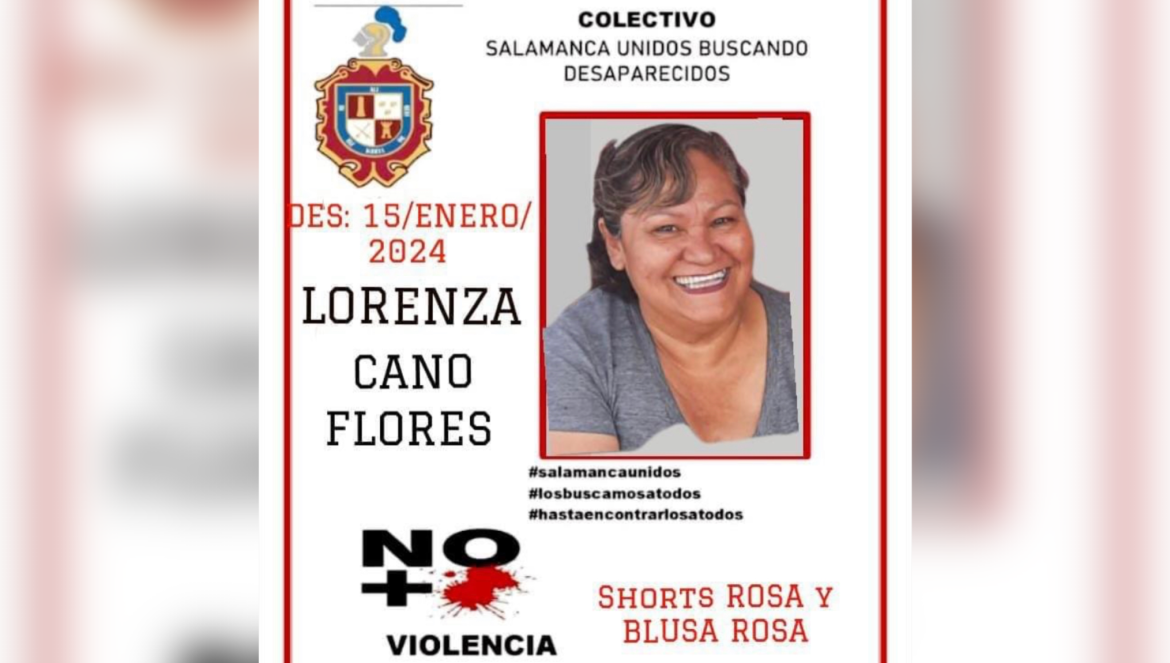 Salamanca, Gto. (16/enero/2024). – La buscadora Salmantina Lorenza Cano Flores está reportada como desaparecida luego de que hombres armados se la llevaron de su domicilio en la colonia Ampliación el Cerrito.