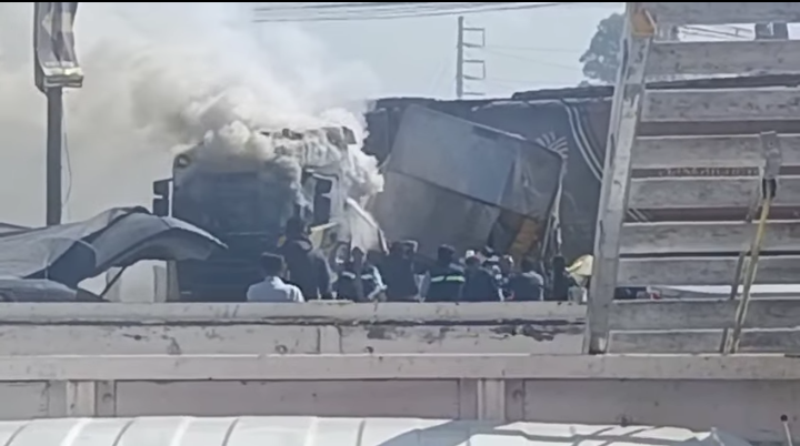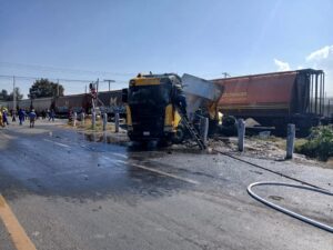 Elementos de Protección Civil y Bomberos atendieron un incendio que se generó tras el impacto del tráiler con el tren, contando con el apoyo de la brigada contra incendios de la empresa Lucava.