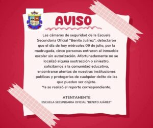 Xichú, Gto. (10/7/2025).- Personal de la Escuela Secundaria Benito Juárez, alertaron a las autoridades sobre sujetos no identificados quienes ingresan a las instalaciones del plantel durante las noches.