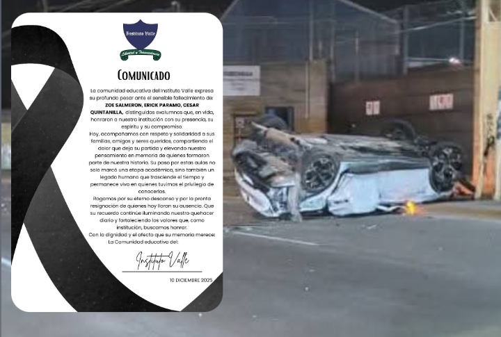 Valle de Santiago, Gto. (11/12/2025).- El Instituto Valle lamentó el deceso de tres de sus ex alumnos, en el accidente automovilístico ocireido la noche de este martes, sobre el bulevar Insurgentes y Revolución.