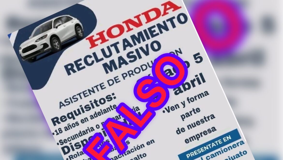 Celaya, Gto. 26 de marzo de 2025.- Luego de que empezó a circular en redes sociales una convocatoria para reclutamiento por parte de la empresa HONDA; en un comunicado de prensa, la empresa lanzó un llamado de ALERTA al asegurar que dicho mensaje es FALSO.