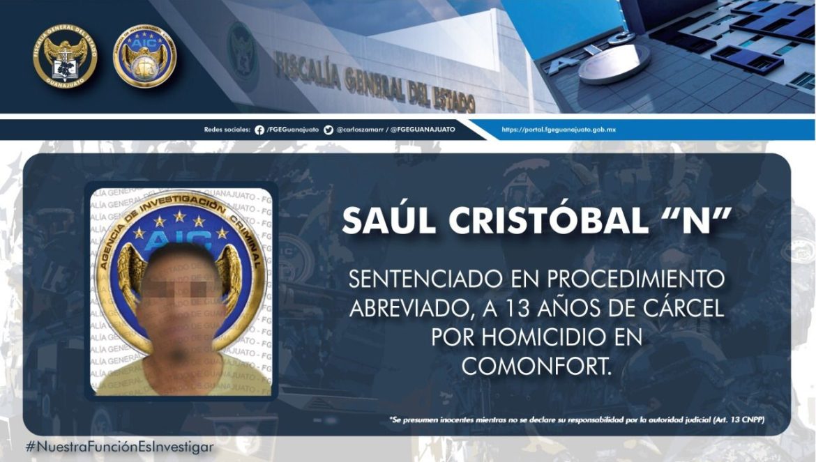Comonfort, Gto., 24 de enero de 2023.- La Fiscalía General del Estado obtuvo un fallo condenatorio en contra de un sujeto que privó de la vida a un hombre en un banco de tepetate ubicado en la comunidad La Merced. SAÚL CRISTÓBAL “N”, alias “El Paquiao”, se apegó a un procedimiento abreviado y aceptó su responsabilidad en el crimen, por lo que pasará 13 años en la cárcel.