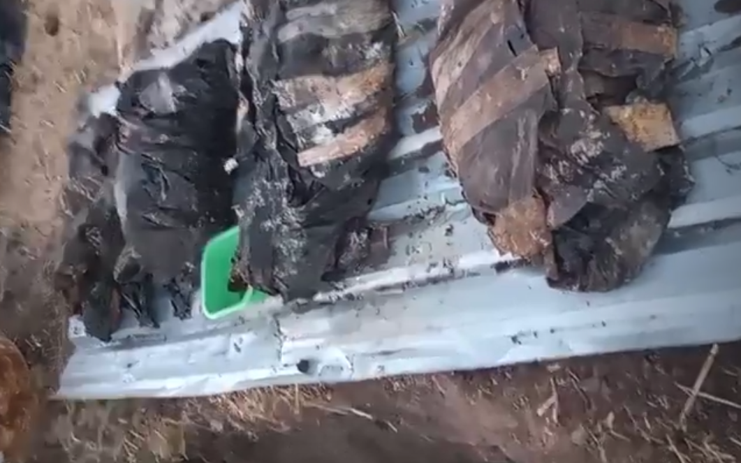 En las imágenes se aprecia la fosa y sobre una lámina, al menos 5 bolsas con los restos, además se mostró una chamarra color negro, de talla mediana y otra color rojo, la cual aún vestía uno de los cuerpos.