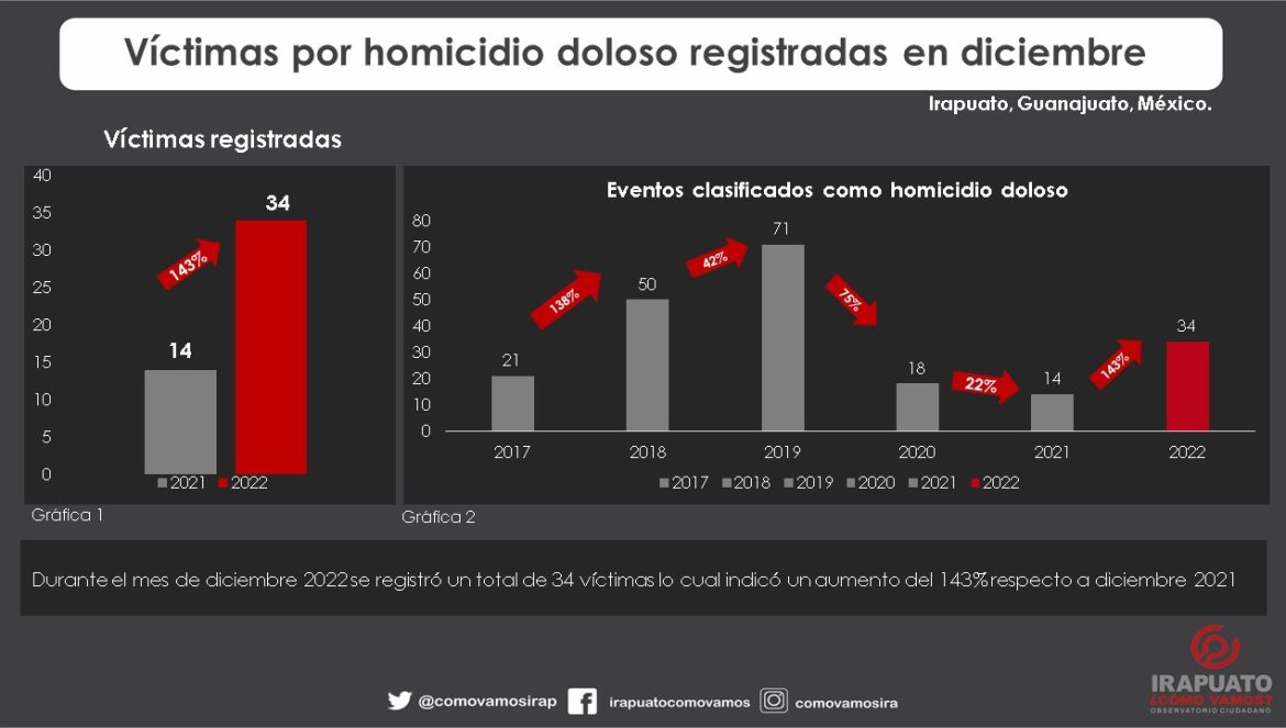 Irapuato, Gto. (3/enero/2023).- Un total de 34 irapuatenses fueron asesinados en el mes de diciembre, de acuerdo al reporte mensual de víctimas por homicidio doloso del Observatorio Ciudadano Irapuato Cómo Vamos.
