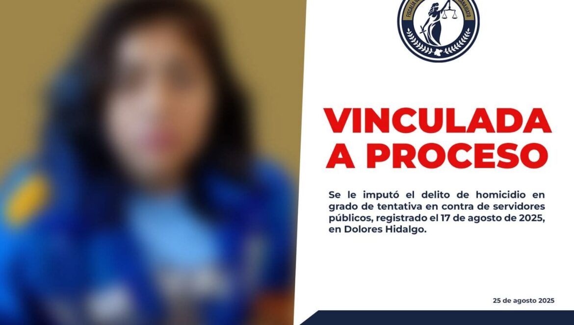 Dolores Hidalgo, Gto. (26/8/2025).- La Fiscalía General del Estado logró la vinculación a proceso penal en contra de Adriana Andrea, señalada como generadora de violencia en el municipio de Dolores Hidalgo, tras acreditar su probable responsabilidad en hechos ocurridos el 17 de agosto de 2025, donde policías municipales fueron agredidos con disparos de arma de fuego durante una persecución.