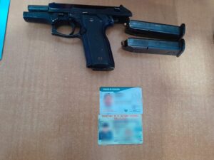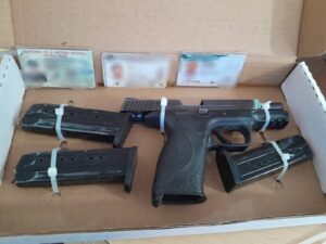 Los detenidos son un hombre de 55 años de edad, originario de la Ciudad de México, a quien se le aseguró una pistola abastecida con 15 cartuchos y un cargador extra.