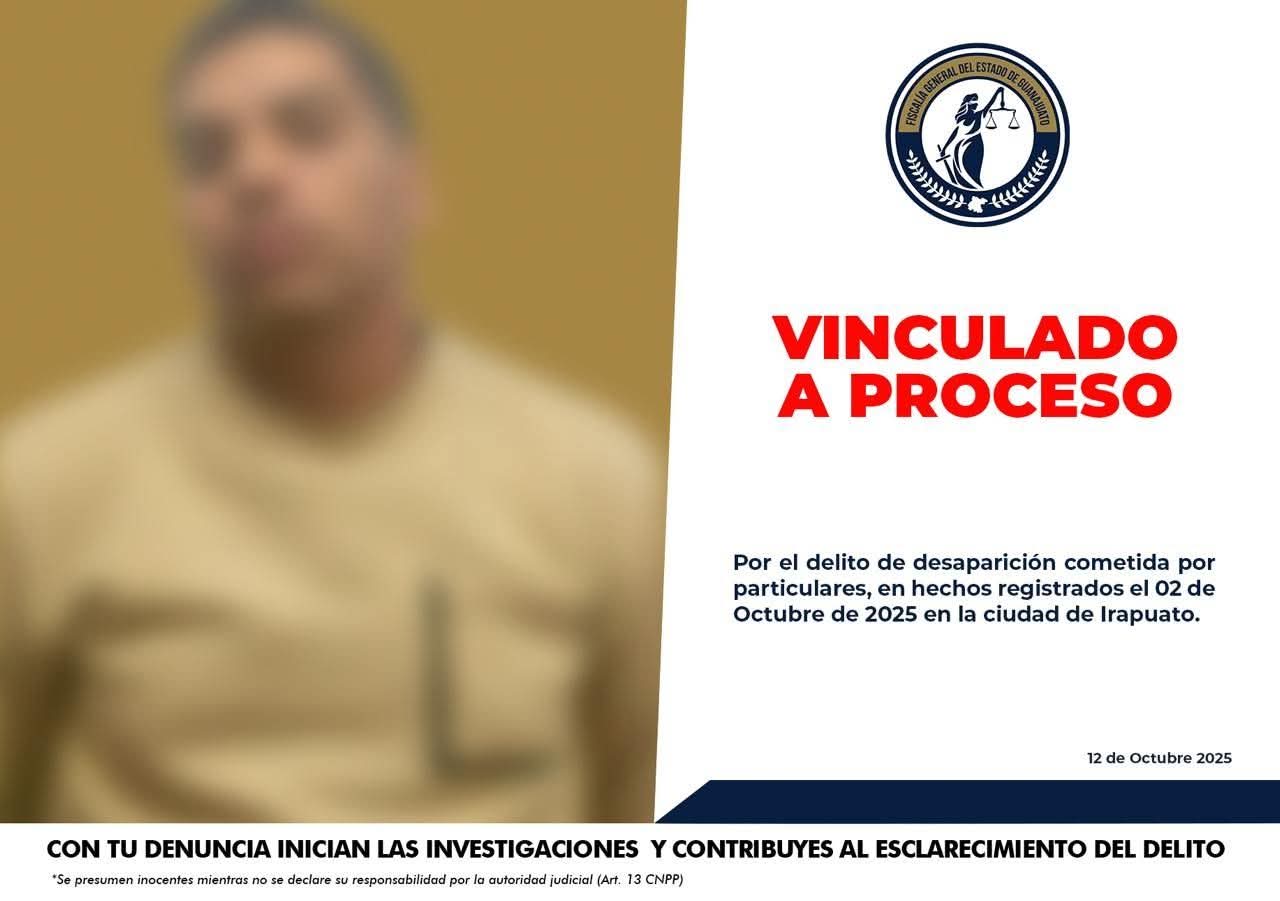 Irapuato, Gto. (13/10/2025).- En un trabajo coordinado de investigación y con base en elementos sólidos de prueba, se logró la vinculación a proceso de César Guadalupe, por su probable participación en el delito de desaparición cometida por particulares, cometido el pasado 2 de octubre en la ciudad de Irapuato.