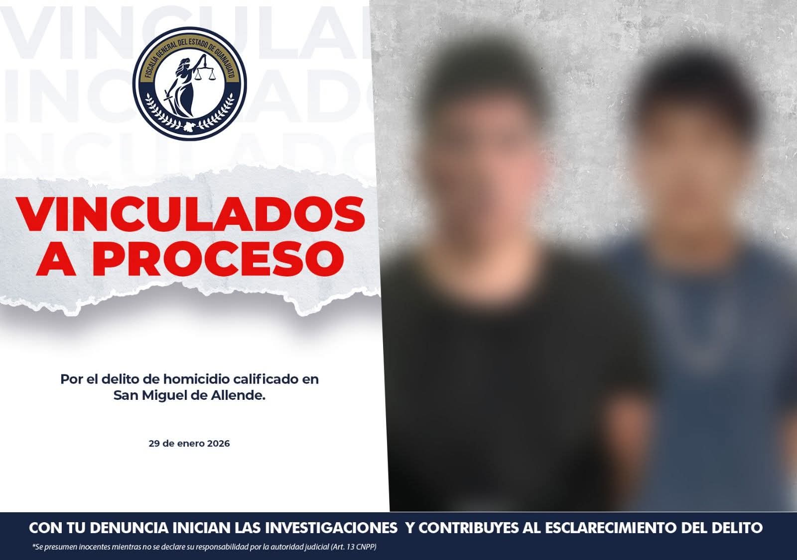 San Miguel de Allende, Gto. (30/1/2026).- Como resultado del seguimiento permanente a una carpeta de investigación por el doble homicidio ocurridos el 13 de marzo de 2025, la Fiscalía General del Estado de Guanajuato logró la vinculación a proceso de Leonardo Isaac, alias “El pecas”, y Alan, alias “canadá”.