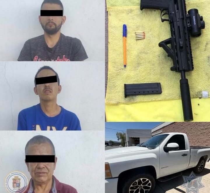 A los detenidos se les aseguró un arma de fuego larga calibre .22 mm, un silenciador, 5 cartuchos útiles y 23 dosis de cristal.