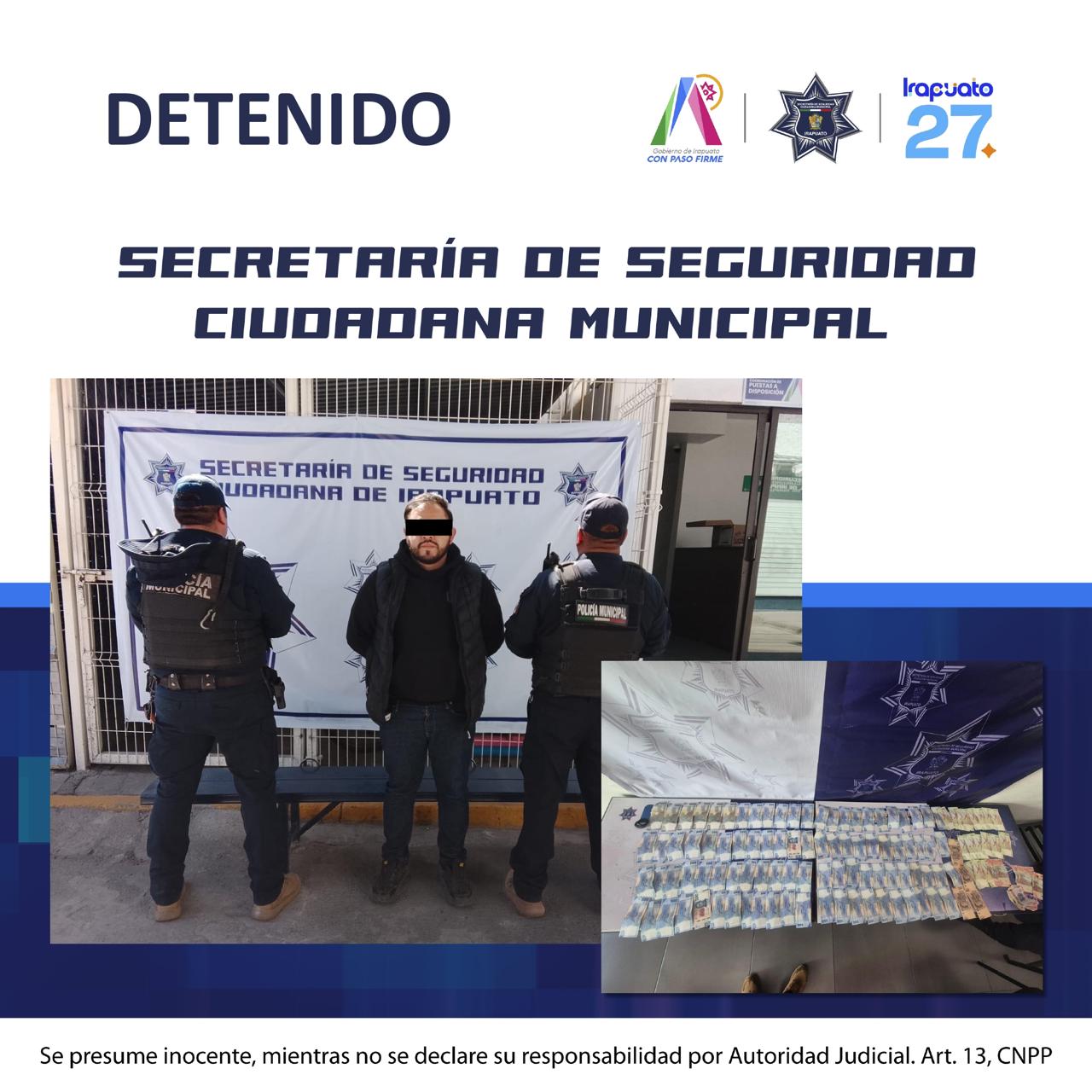 Irapuato, Gto. (9/2/2026).– Gracias a una intervención inmediata derivada de un reporte de robo en proceso, elementos de la Policía Municipal de Irapuato lograron la detención de un individuo presuntamente implicado en el robo con violencia de dinero en efectivo a un ciudadano.