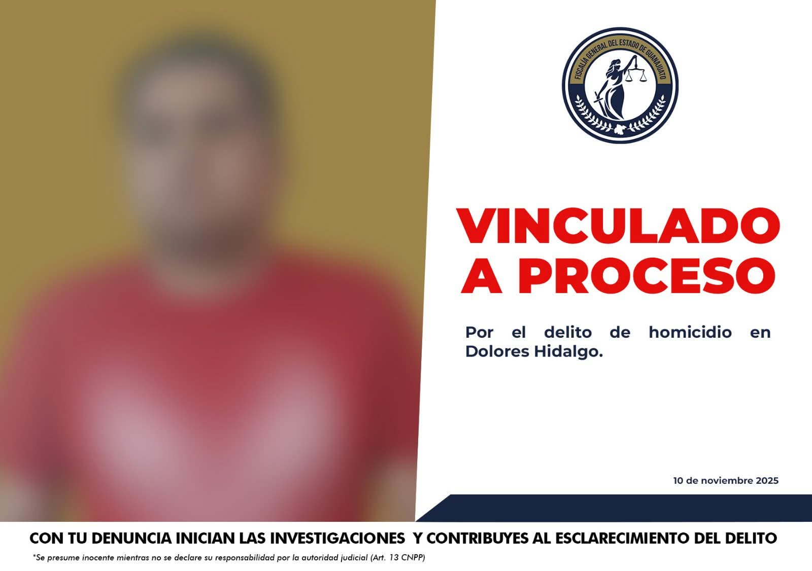 Dolores Hidalgo, Gto. (11/11/2025).- La Fiscalía General del Estado de Guanajuato logró que un sujeto identificado como Hugo, sea vinculado a proceso por el delito de homicidio cometido este 10 de octubre.