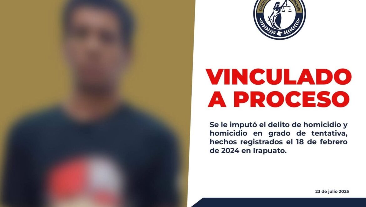 Irapuato, Gto. (23/7/2025).- La Fiscalía General del Estado de Guanajuato informa que ha sido vinculado a proceso penal Luis Brayan, por su probable responsabilidad en los delitos de homicidio y homicidio en grado de tentativa, derivados de un ataque armado ocurrido en la ciudad de Irapuato.