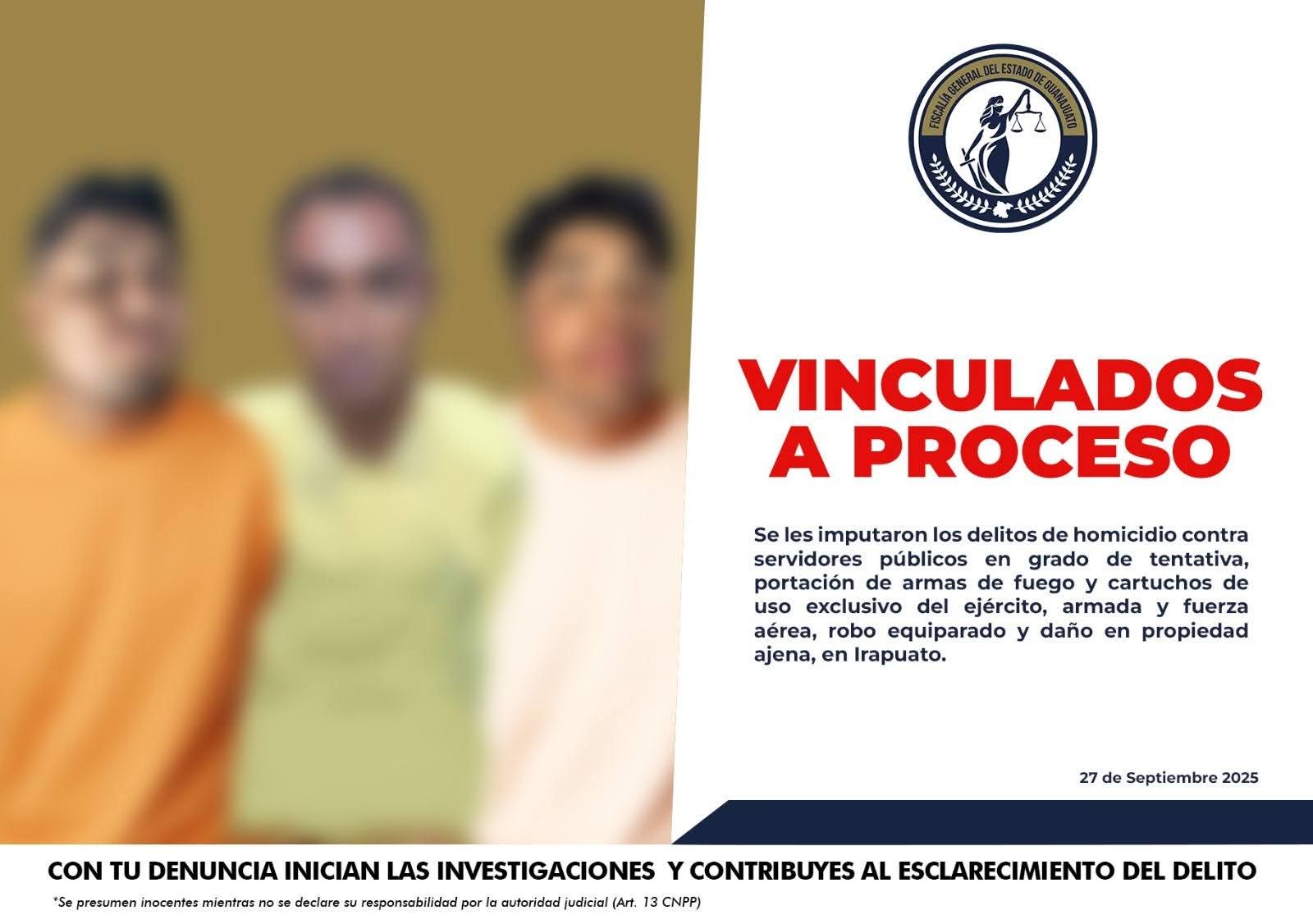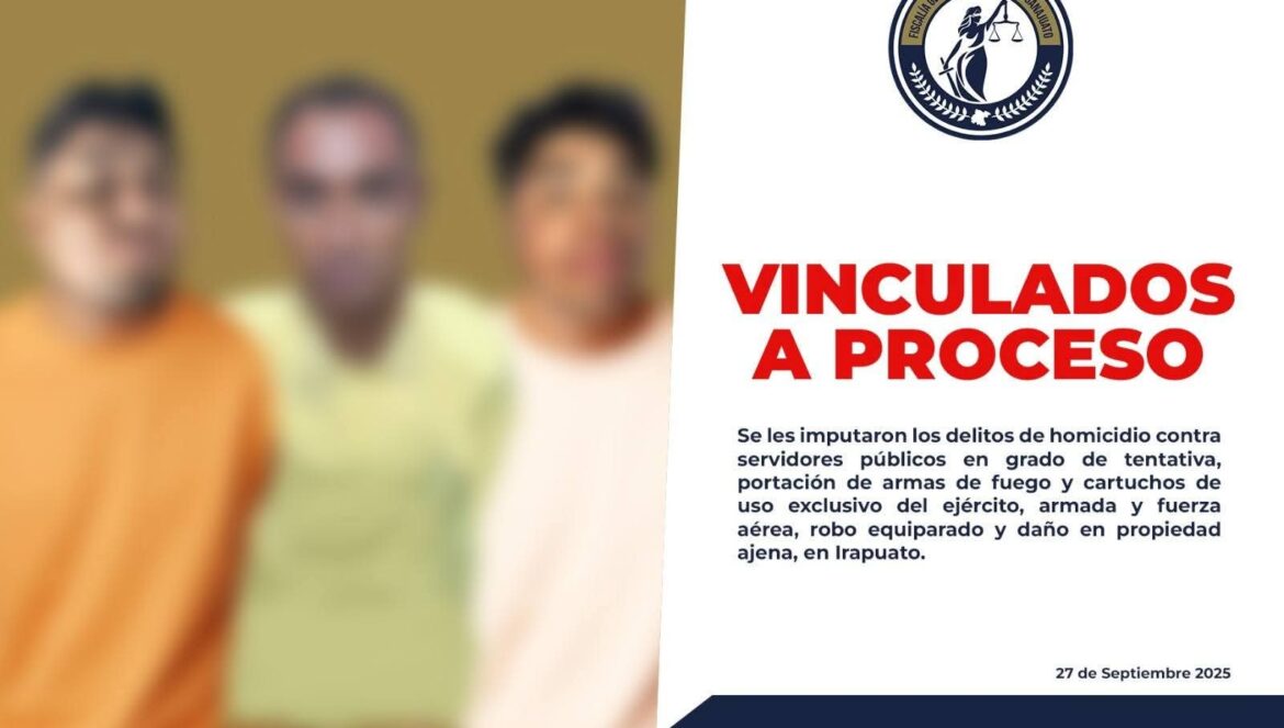 Irapuato, Gto. (28/9/2025).- La Fiscalía General del Estado de Guanajuato recabó pruebas y obtuvo que 3 presuntos criminales permanezcan en prisión, acusados de intentar asesinar a más de una decena de elementos de seguridad del