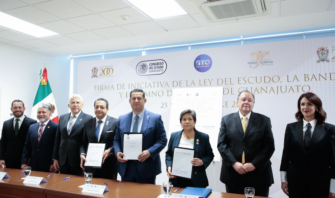 Guanajuato, Gto., 25 de septiembre del 2023.- El Gobernador del Estado, Diego Sinhue Rodríguez Vallejo, firmó una iniciativa de ley que busca regular los símbolos estatales: escudo, bandera e himno. Entre otros aspectos, contempla que el escudo forme parte de una bandera estatal y que sea el 20 de diciembre de cada año que se celebre el “día de la bandera de Guanajuato”.