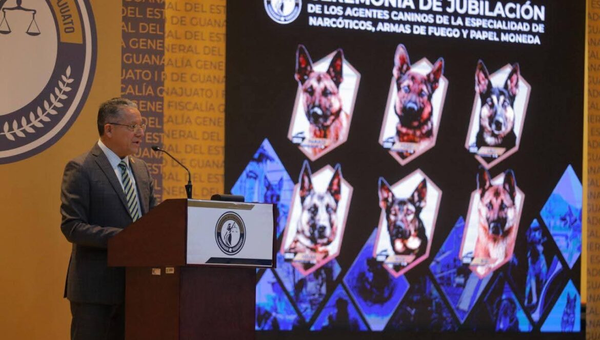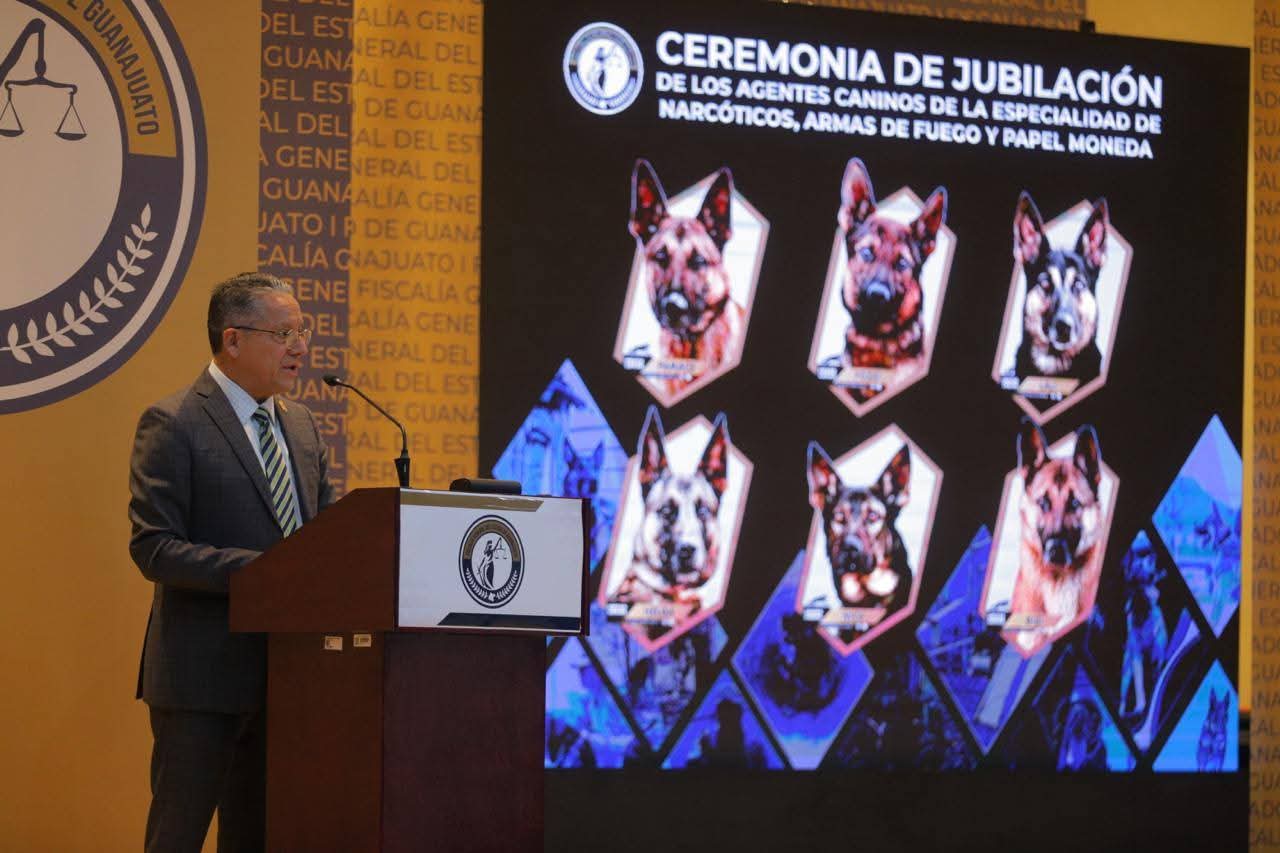Gto. (16/12/2025).- Un servicio ejemplar concluyó en la Fiscalía General del Estado de Guanajuato con la emotiva Ceremonia de Jubilación de los Agentes Caninos, héroes silenciosos que dedicaron años de su vida a la detección de narcóticos, armas de fuego y papel moneda.