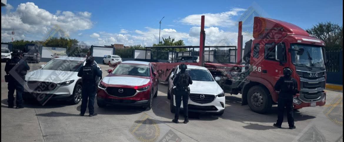 Apaseo el Alto, Gto. (29/9/2025).- Elementos del Grupo de Operaciones Especiales de Apaseo el Alto recuperaron 4 vehículos y un remolque robados, sobre el Macro Libramiento Apaseo el Grande – Palmillas a la altura de la comunidad Espejo.