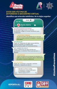 Recordó que algunos de las modalidades identificadas son secuestro virtual o simulado, entrega de premios o sorteos falsos, amenazas de grupos delictivos, llamadas de auxilio, ofertas laborales o de préstamos, entre otros.