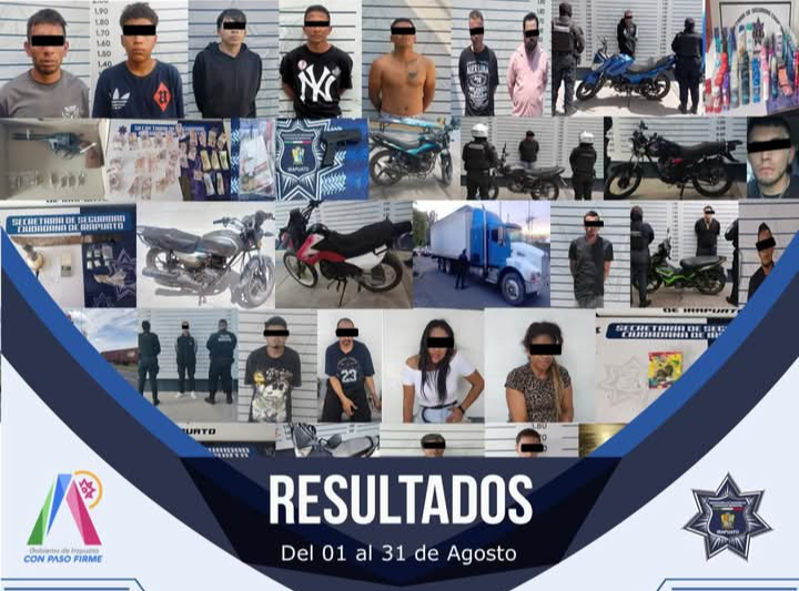 En este periodo, integrantes de las direcciones de Policía Municipal y Tránsito, remitieron por diversas faltas administrativas y conductas antisociales a 818 personas, quienes fueron conducidas a los Juzgados Cívicos, mientras que, 67 personas fueron presentadas ante el Ministerio Publico por su presunta participación en diversos delitos.