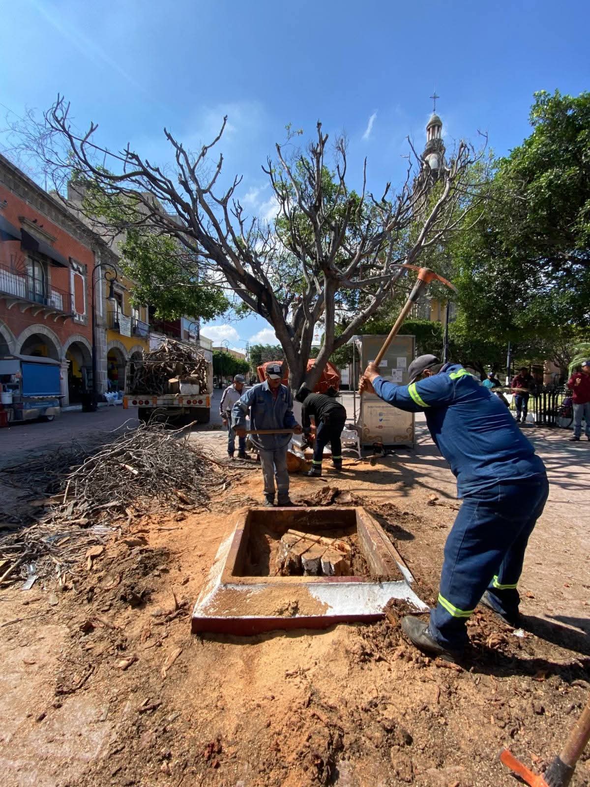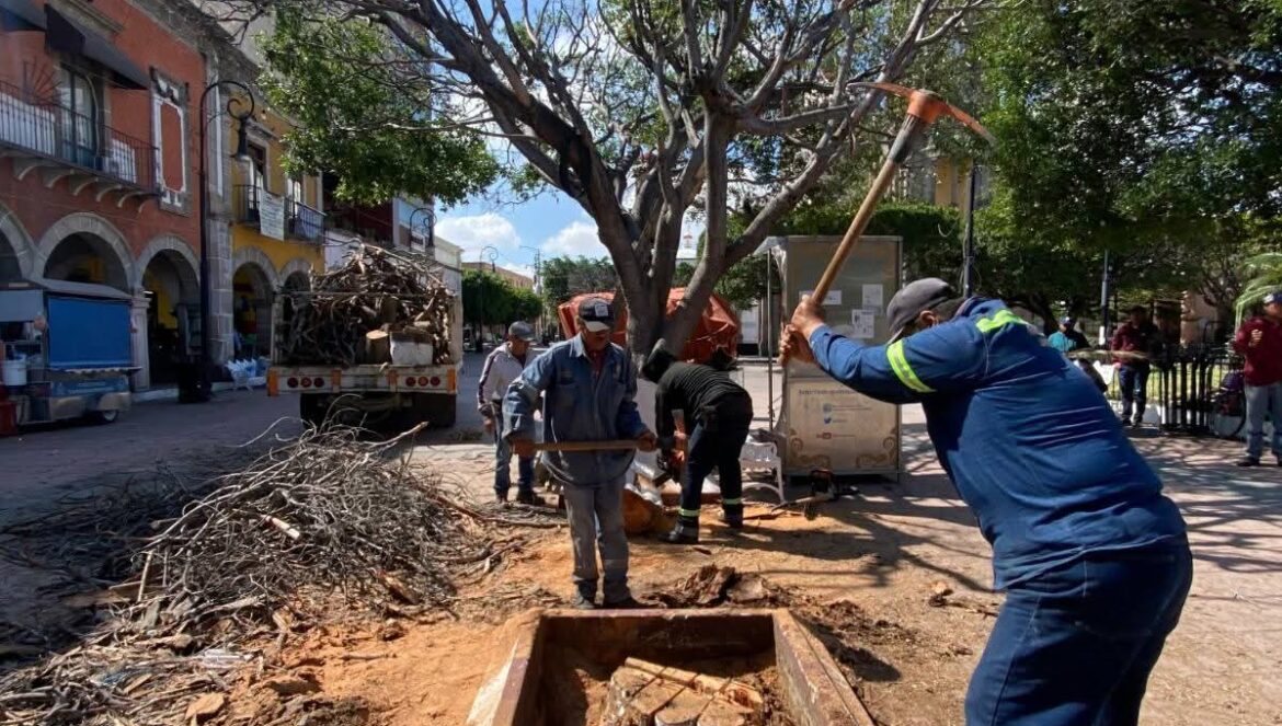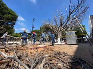 Salamanca, Gto. (13/10/2025).- En seguimiento al dictamen emitido por la Dirección de Ordenamiento Territorial y Medio Ambiente del Municipio de Salamanca, en el que se reportó el deterioro de 3 árboles de la especie Ficus ubicados en el Jardín Constitución, se inició el retiro de los ejemplares secos, los cuales serán reemplazados por árboles de la misma especie.
