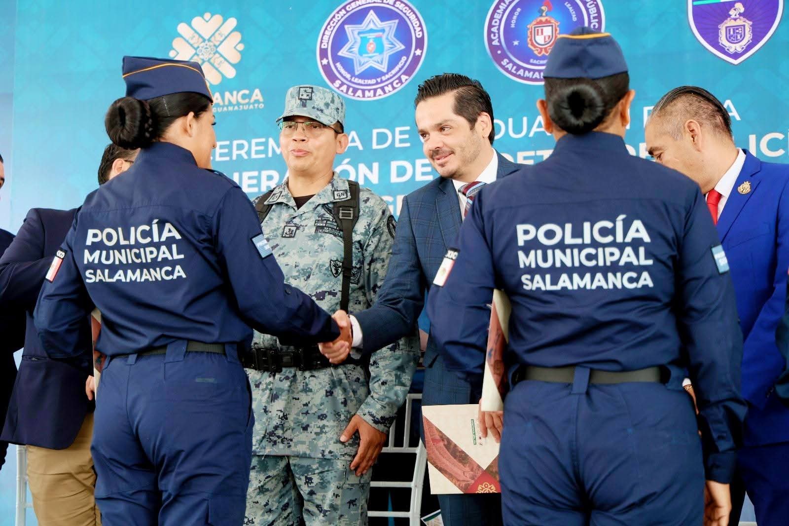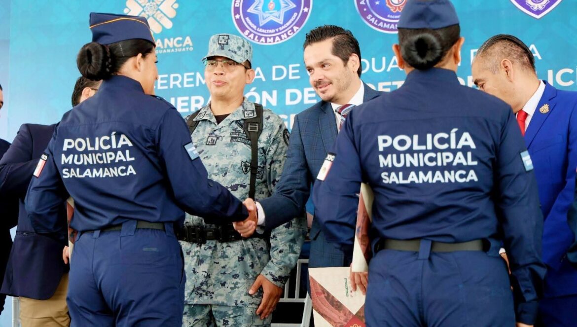 Salamanca, Gto. (23/7/2025).- En una emotiva ceremonia celebrada este martes, mujeres y hombres comprometidos con el cambio en Salamanca y en el país concluyeron su formación académica para integrarse a las filas de la Dirección de Seguridad Pública, así como de Tránsito y Vialidad.