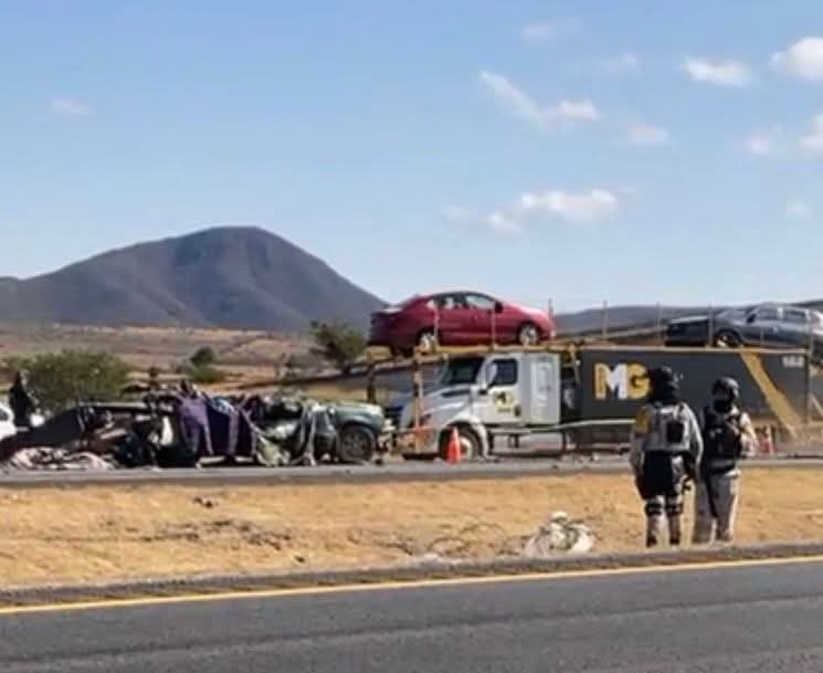 En la escena quedó la pesada unidad volcada, así como una camioneta pick up color negro completamente destrozada, mientras que los restos de las personas afectadas quedaron esparcidos.