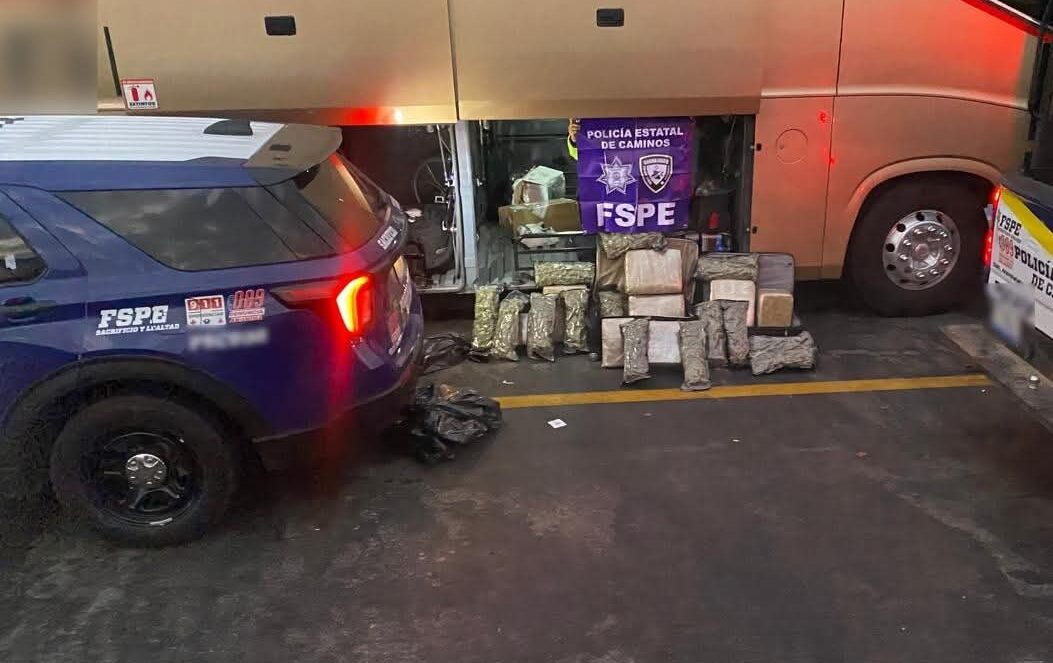 Durante la inspección, el personal operativo tuvo contacto con un autobús del Servicio Público Federal, modelo 2020, color dorado. En la revisión conforme a los protocolos establecidos, se localizaron paquetes con hierba verde y seca con características propias de la marihuana.