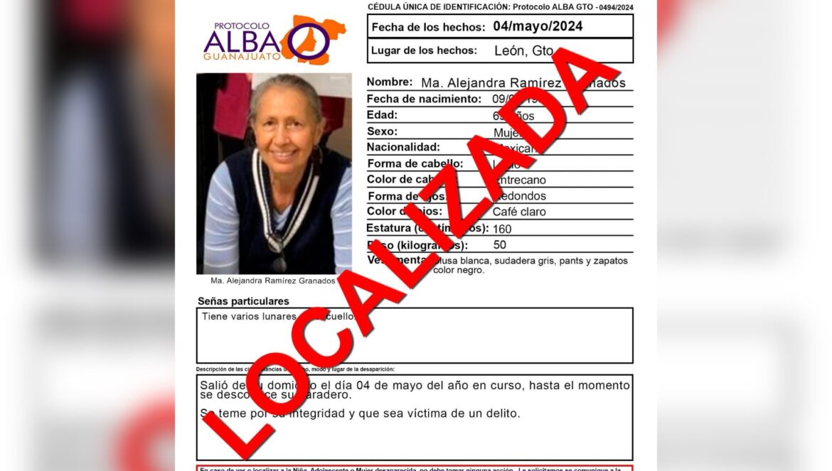 Guanajuato, Gto. 21 de mayo de 2024.-* La Fiscalía de Guanajuato informó sobre la localización de Ma. Alejandra Ramírez Granados de 65 años de edad, quien por su propia voluntad se encontraba en el estado de Jalisco.
