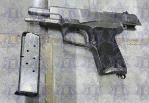 Policías municipales aseguraron la camioneta que contaba con placas del estado de Baja California y al interior se aseguró una pistola calibre .45 mm., con un cargador sin cartuchos, 3 celulares, así como los artículos robados minutos antes.