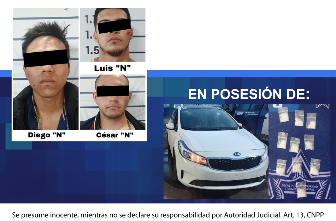 Las personas detenidas responden a los nombres de: Carlos Ángel de 29 años de edad, Alexander de 24 años y Diego Alfonso de 19 años de edad, quienes fueron puestos a disposición del Ministerio Publico, así como el automóvil asegurado y varias dosis de droga para que se efectúen las respectivas investigaciones.