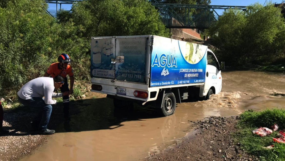Irapuato, Gto. (14/julio/2023).- Elementos de Protección Civil rescataron a ocupantes de una camioneta repartidora de agua que se quedaron atorados en la corriente del río Silao.