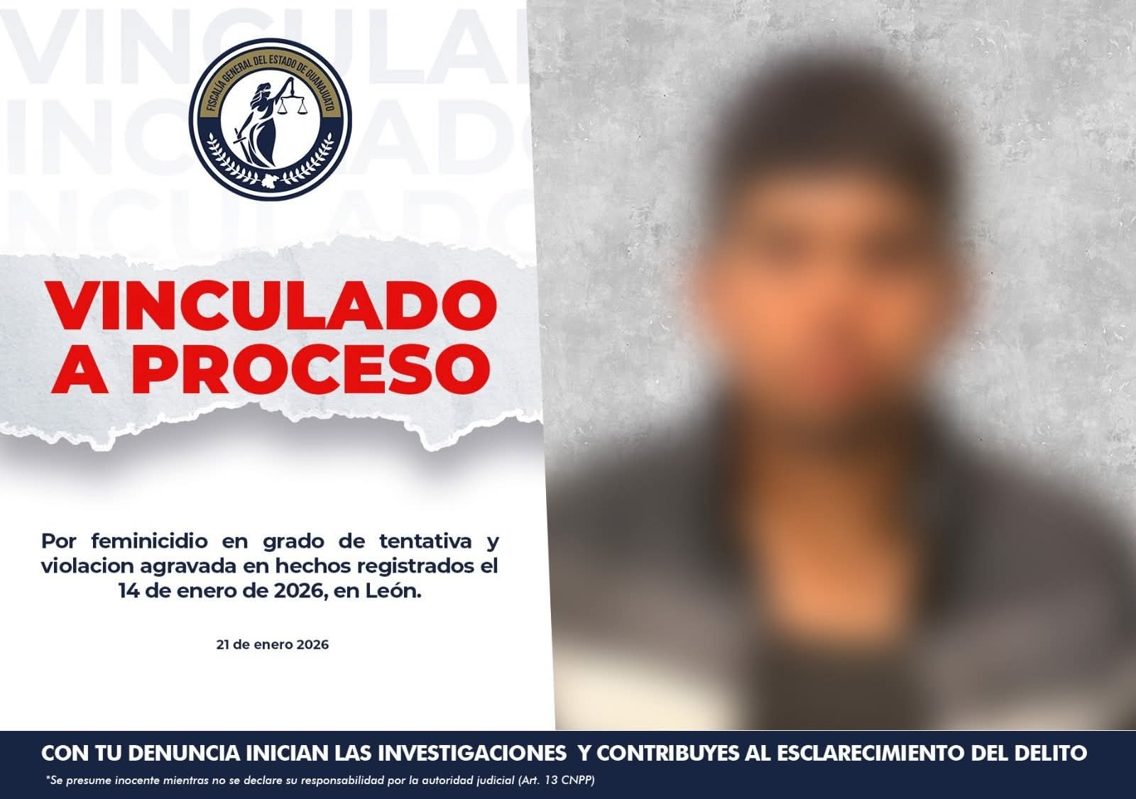León, Gto. (21/1/2026).- La Fiscalía General del Estado de Guanajuato logró la vinculación a proceso penal y la imposición de prisión preventiva para Edwin Arturo, por su probable responsabilidad en los delitos de feminicidio en grado de tentativa y violación agravada, cometidos en agravio de una adolescente en León.