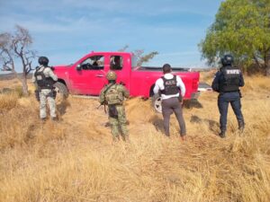 Durante recorridos sobre un camino de terracería que comunica la comunidad de Pozos con Rincón de Centeno, el personal operativo detectó un vehículo tipo pick up, color rojo, tripulado por personas armadas.