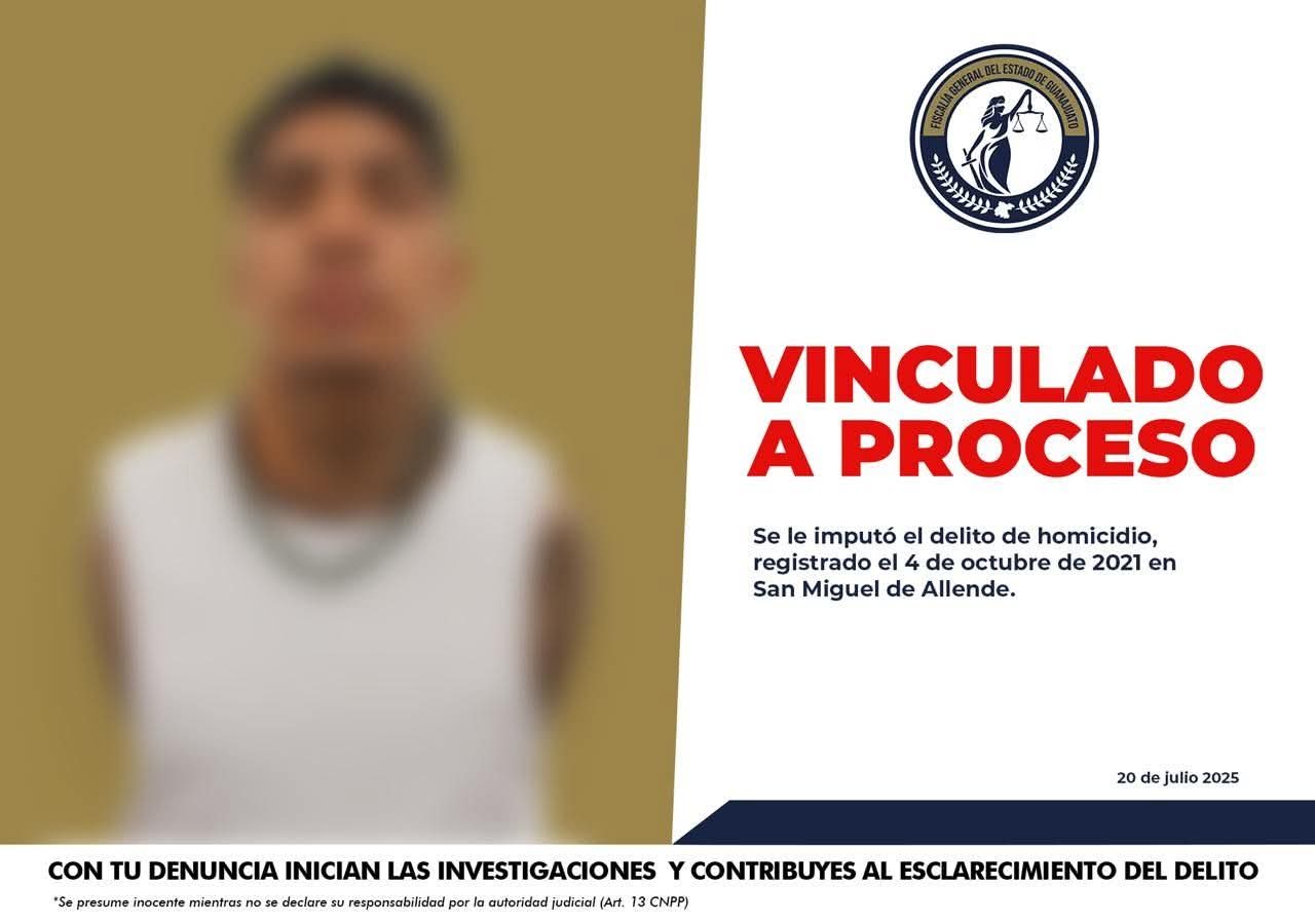 San Miguel de Allende, Gto. (21/7/2025).- Un sujeto identificado como Germán, alias “El Bebé”, ha sido vinculado a proceso por su probable participación en un homicidio cometido en San Miguel de Allende.