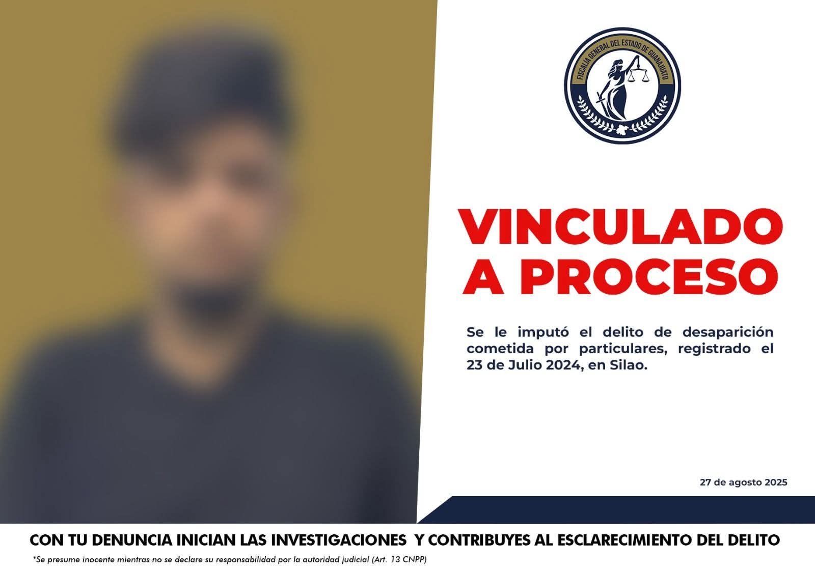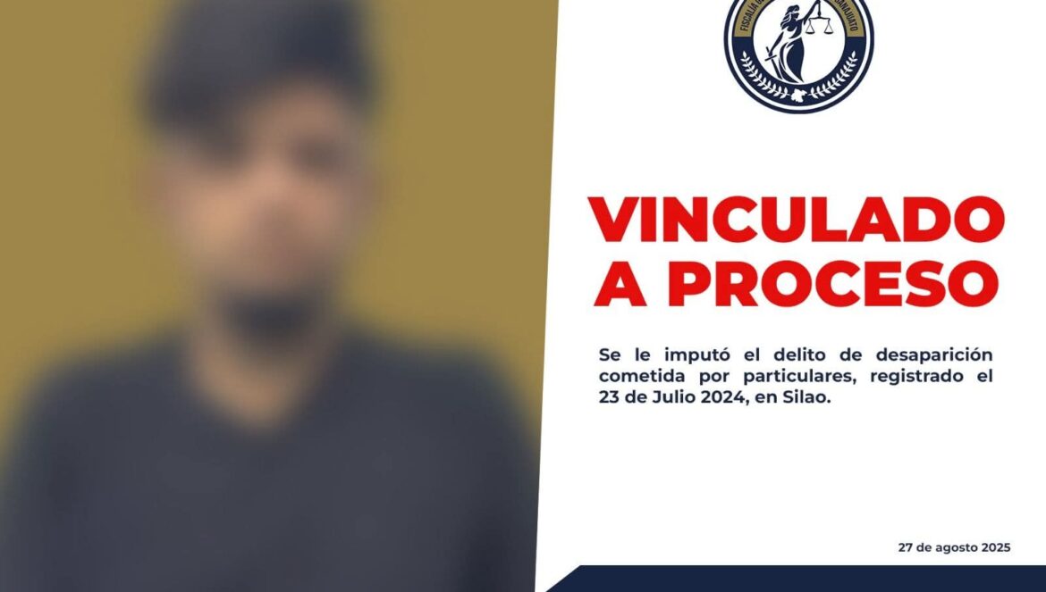 Silao, Gto. (27/8/2025).- La Fiscalía General del Estado de Guanajuato informa que, derivado de la investigación ministerial y de las pruebas presentadas ante la autoridad judicial, se logró la vinculación a proceso penal de Julio Alberto alias “el mora”, por su probable responsabilidad en el delito de desaparición cometida por particulares.