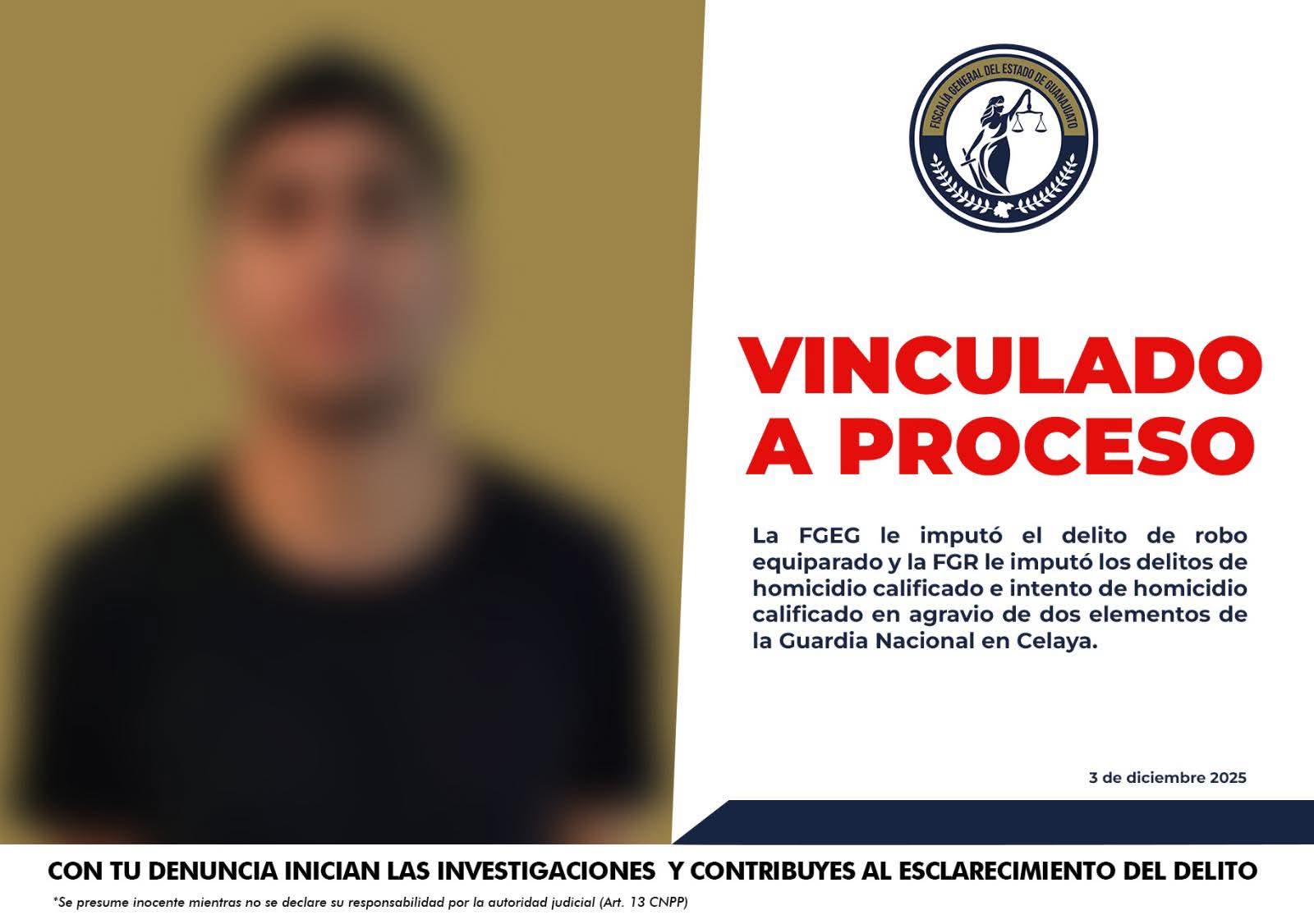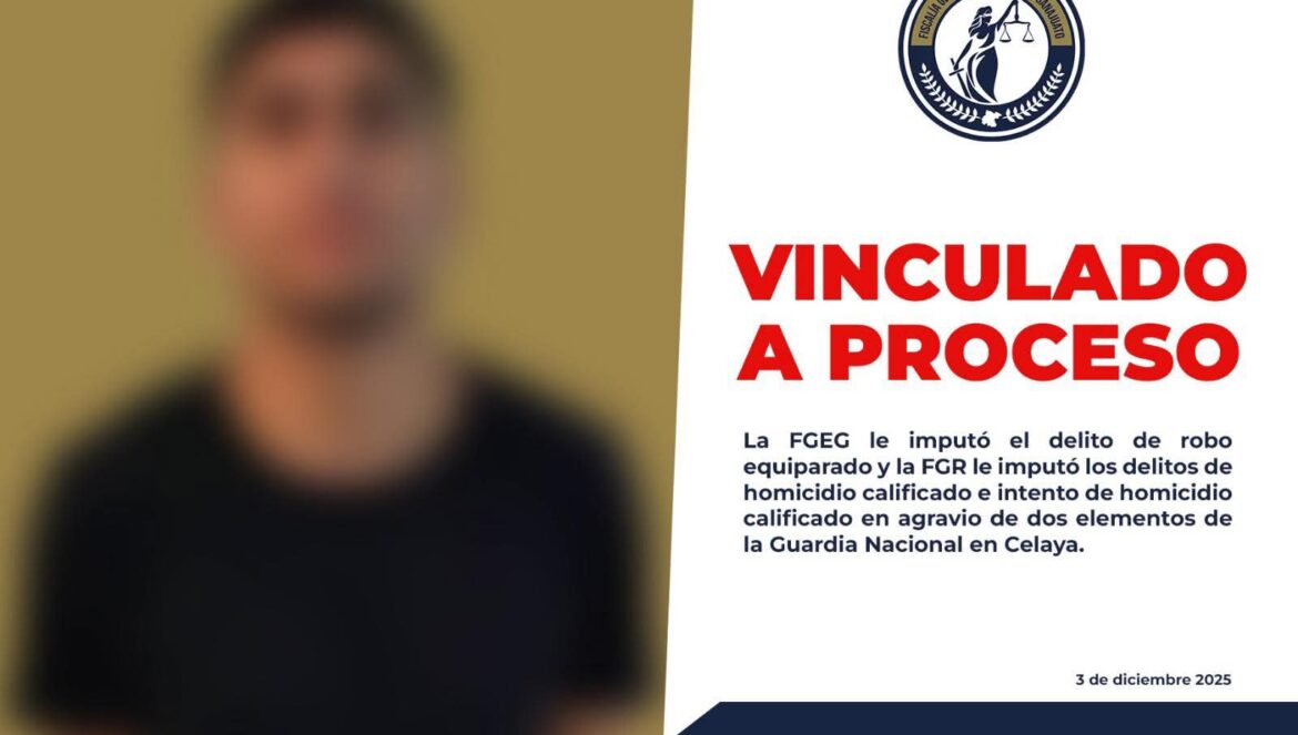 Celaya, Gto. (3/12/2025).- La Fiscalía General del Estado de Guanajuato y la Fiscalía General de la República lograron la captura y vinculación a proceso penal del presunto responsable de una agresión armada contra dos elementos de la Guardia Nacional, registrada el 11 de octubre de 2025 en Celaya, donde una de las víctimas perdió la vida y otra resultó gravemente lesionada.