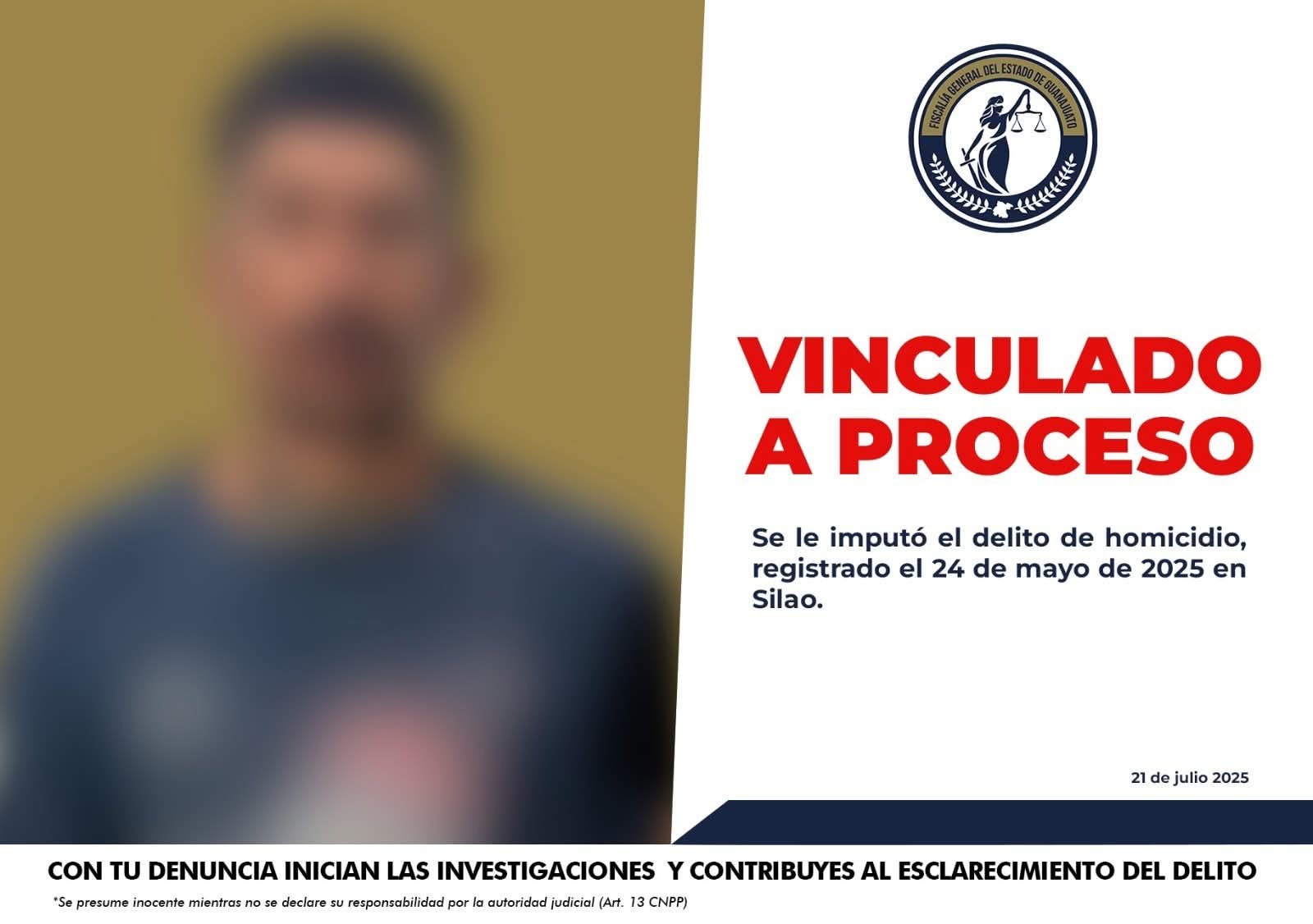 Silao, Gto. (21/7/2025).- La Fiscalía General del Estado de Guanajuato informa que, derivado de los hechos ocurridos el 24 de mayo de 2025, fue vinculado a proceso Armando “N”, alias «el mandingo», por su probable participación en el delito de homicidio.