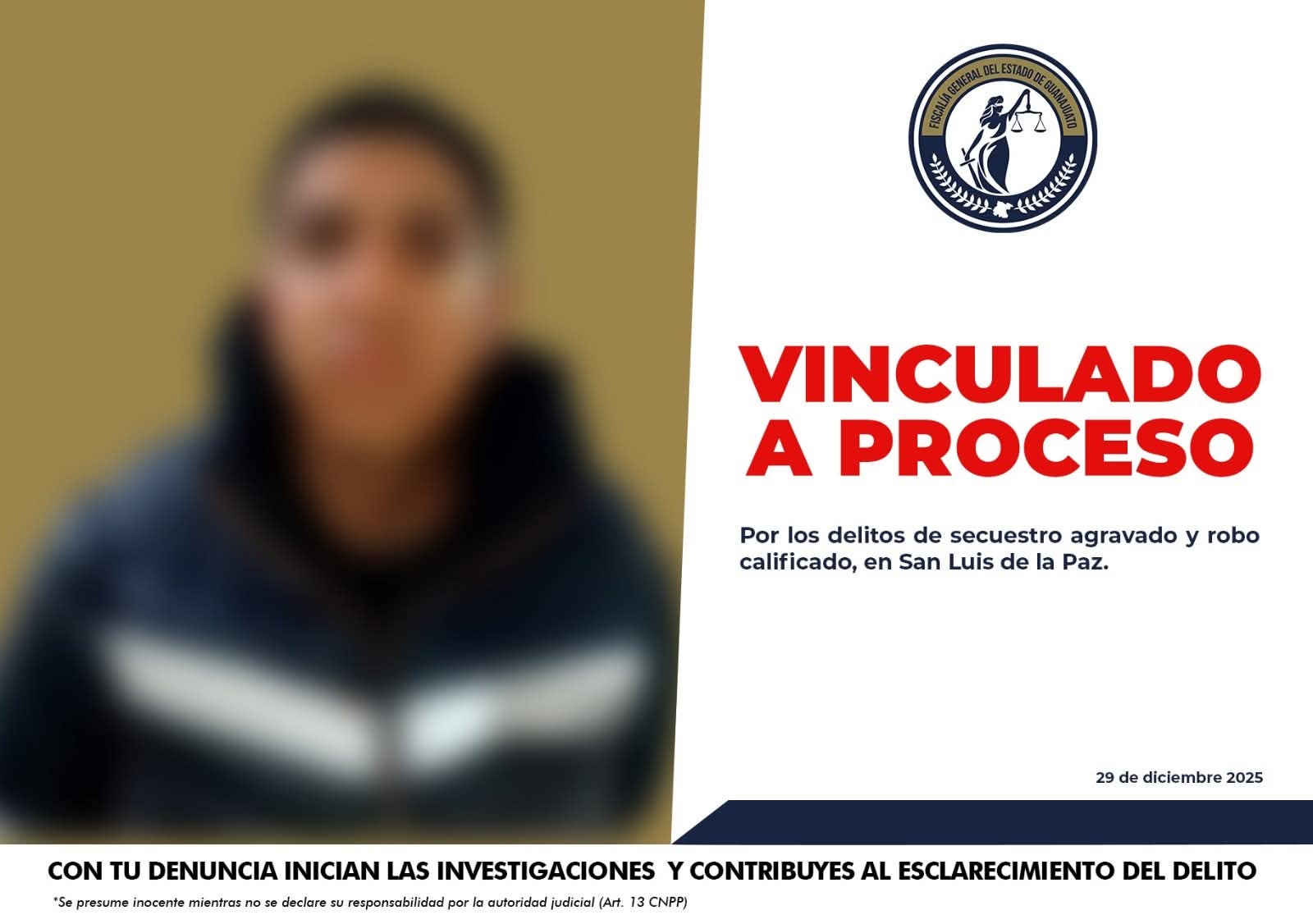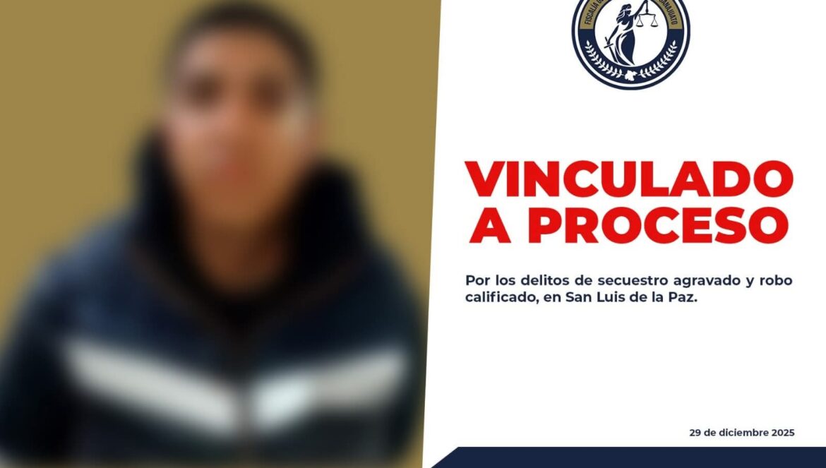 San Luis de la Paz, Gto. (30/12/2025).- La Fiscalía General del Estado de Guanajuato obtuvo la vinculación a proceso de un sujeto identificado como Eduardo, por su presunta responsabilidad en los delitos de secuestro agravado y robo calificado, registrados en San Luis de la Paz.